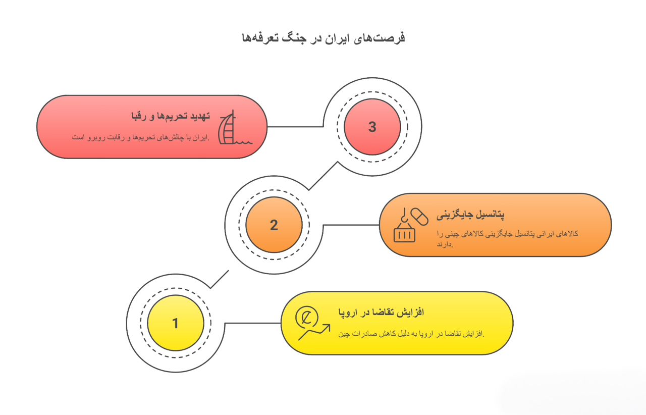 همانطور که در دل هر بحران اقتصادی، فرصتهایی تازه متولد میشوند، جنگ تعرفهای میان چین و غرب نیز میتواند به یک نقطه عطف برای صادرات ایران تبدیل شود. در شرایطی که تعرفههای گمرکی اتحادیه اروپا و آمریکا مانع بزرگی برای کالاهای چینی شدهاند، ایران میتواند با برنامهریزی درست سهم مناسبی از این بازارها را به دست آورد. مهمترین فرصتهای صادراتی ایران در این زمینه عبارتاند از: